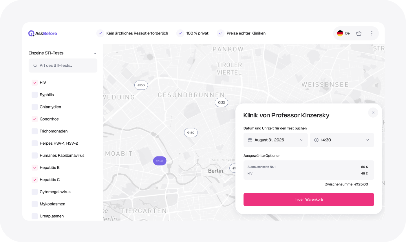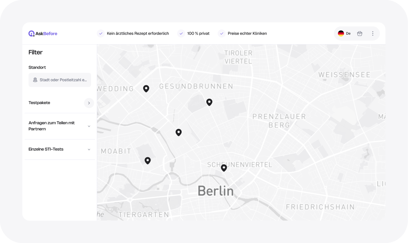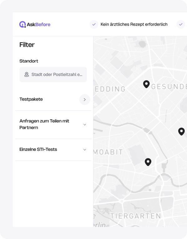 Werden Sie Teil von AskBefore – einer Plattform, auf der Partner STI-Testergebnisse sicher austauschen und Kliniken für Tests finden.