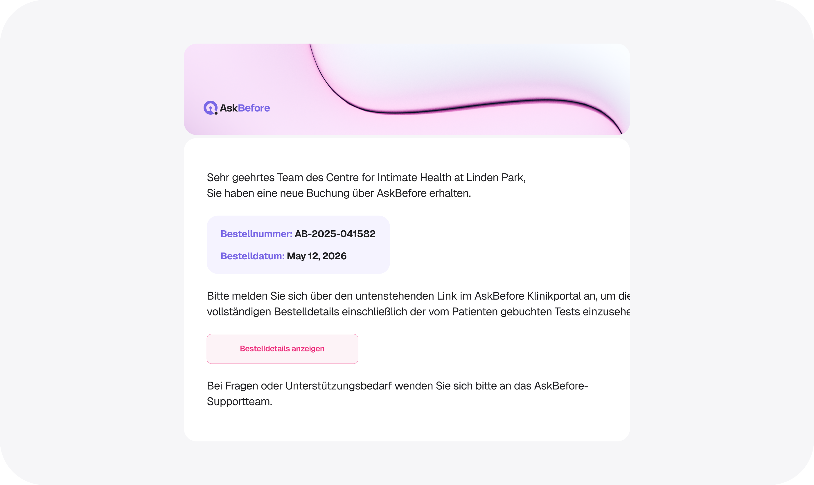 Jede Buchung löst eine E‑Mail mit Bestell-ID und einem sicheren Link zu Ihrem Client-Portal aus, in dem Sie die bestellten Tests einsehen und die Buchung verwalten können.